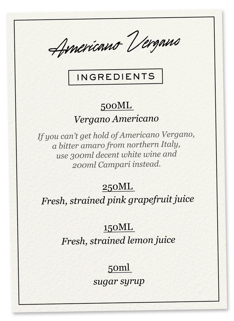 Here, the brothers share their recipe for the Americano Vergano, a low-alcohol, sunny-day twist on the classic Americano that will have everyone at your next barbecue singing your praises. It makes enough to serve several thirsty friends.