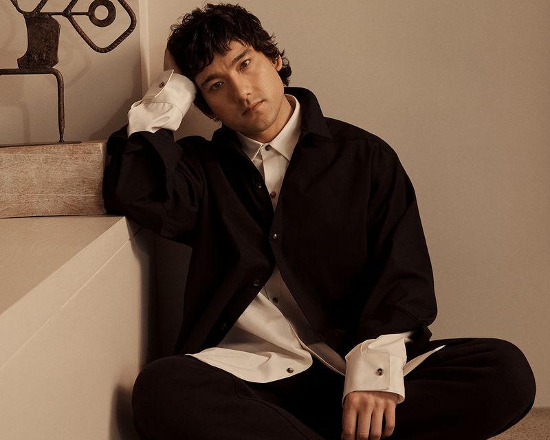 Three days before we meet in an east London bakery, Mr Will Sharpe was in Paris. Specifically in the front row of LOEWE’s menswear show, sandwiched between Mr Troye Sivan and Mr Kit Connor. His recent excursions around Europe (he also went to Milan Fashion Week for Armani) have proven to be an overwhelming learning experience for someone who claims to have no relationship with fashion whatsoever.