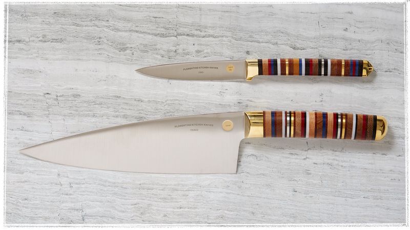 “My go-to is a beautiful 20cm chef’s knife and a paring knife by Florentine Kitchen Knives. The knives are custom made, both with a gorgeous handle of alternating stacked rings of coloured micarta, leather and metal. Florentine Kitchen Knives are made in Barcelona by an Israeli designer called Tomer Botner. The amount of work that goes into each knife is astounding.”