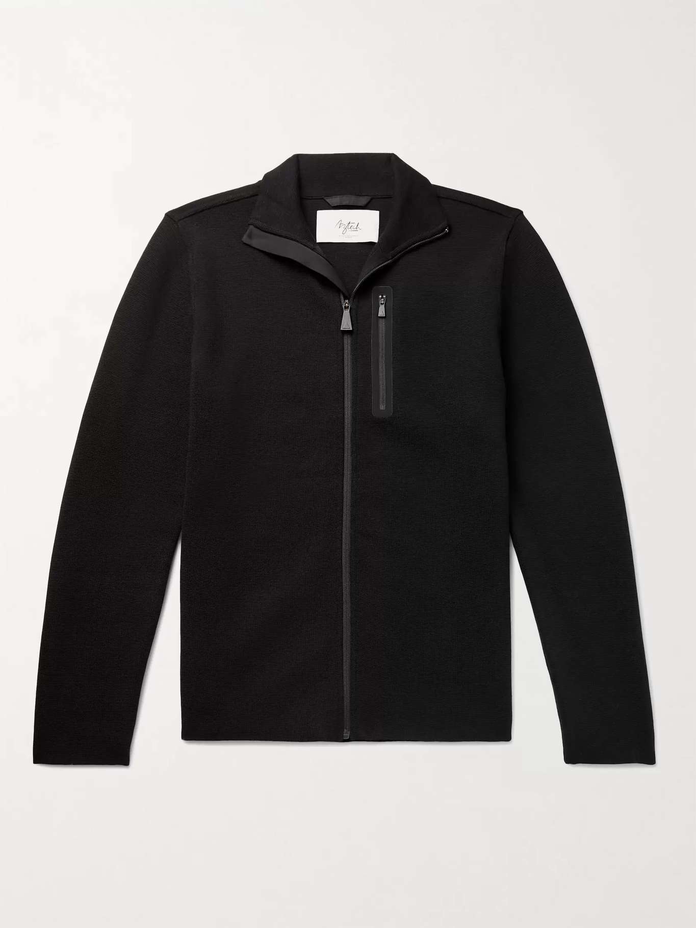 - Funnel neck, chin guard, chest zipped pocket, shell elbow patches
