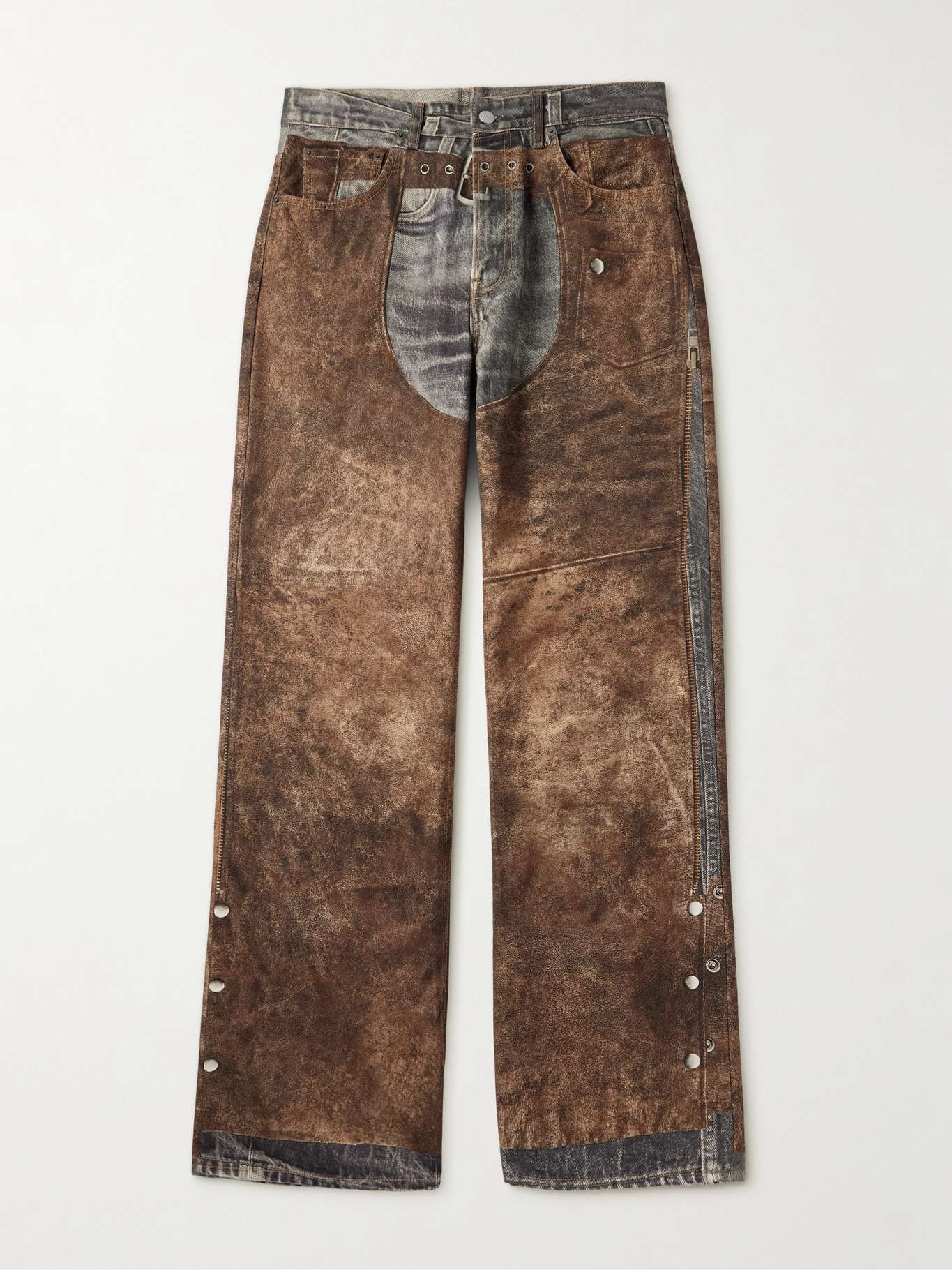 زُين هذا البنطال من توقيع Acne Studios بطبعات موسمية بتأثير مُخادع ليبدو كبنطال جلدي مُعتق منسّق فوق آخر من الدنيم. صُنع من قطن الكنفا بقصة مستقيمة واسعة.