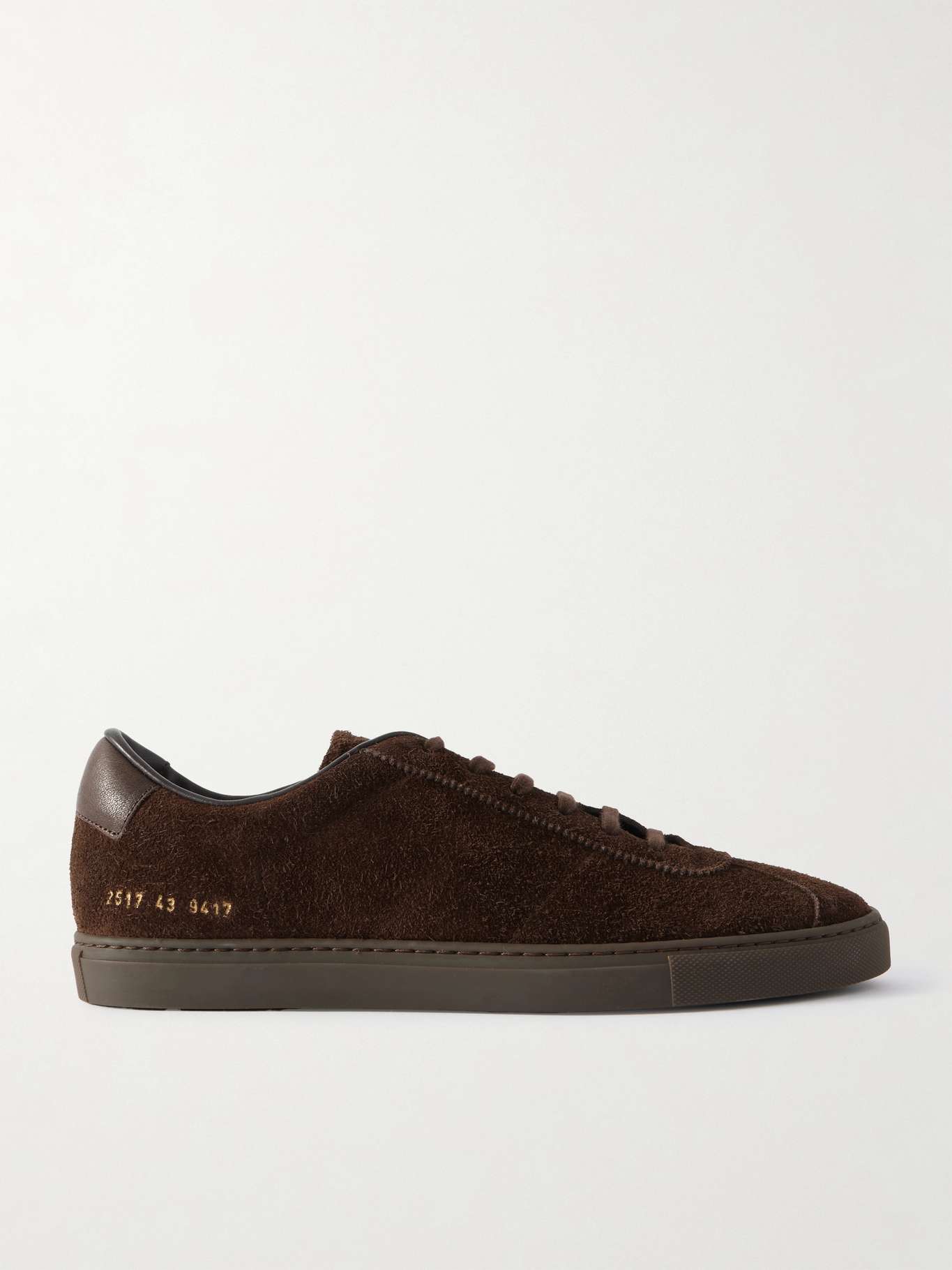 يُعد اللون البني بديلاً عصرياً للألوان الحيادية كالرمادي والأسود. صُنع حذاء السنيكرز هذا من توقيع Common Projects من جلد السويد المُمشط باللون البني الداكن سهل التنسيق. يتسم بحواف من الجلد على الكعبين وزُين بطبعة الأرقام التسلسلية المميزة لدى العلامة باللون الذهبي فوق النعل.