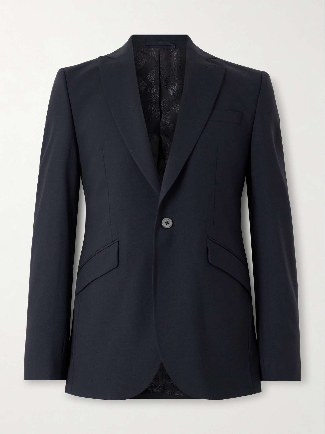 - طيات صدر مدببة،، أكتاف مبطنة، أساور أكمام عريضة بأزرار غير عمليّة، جيب رفيع عند الصدر، جيبان مع طيّات من الأمام، فتحتان من الخلف، جيبان داخليان