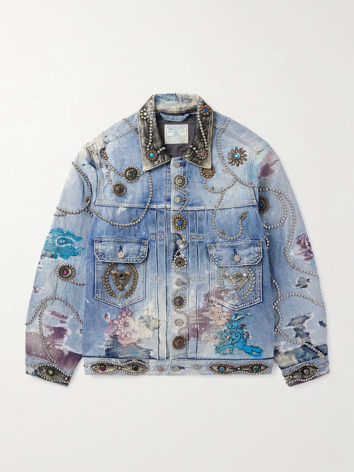 حصرياً لدى MR PORTER. تتميز علامة PROLETA RE ART اليابانية بالأسلوب الفريد من نوعه - وتقوم بتحويل ملابس العمال التقليدية إلى قطع مميزة من خلال استخدام تقنيات تراثية وتفاصيل خاصة. صُنع جاكيت التراكر هذا من الدنيم وزُين بدبابيس معدنية وأحجار كريستال ورُقع من الجلد بالإضافة لقطع قماشية مزينة بطبعات ودرزات بأسلوب ساشيكوويتم إنجازها كلها يدوياً بدقة وعناية.
