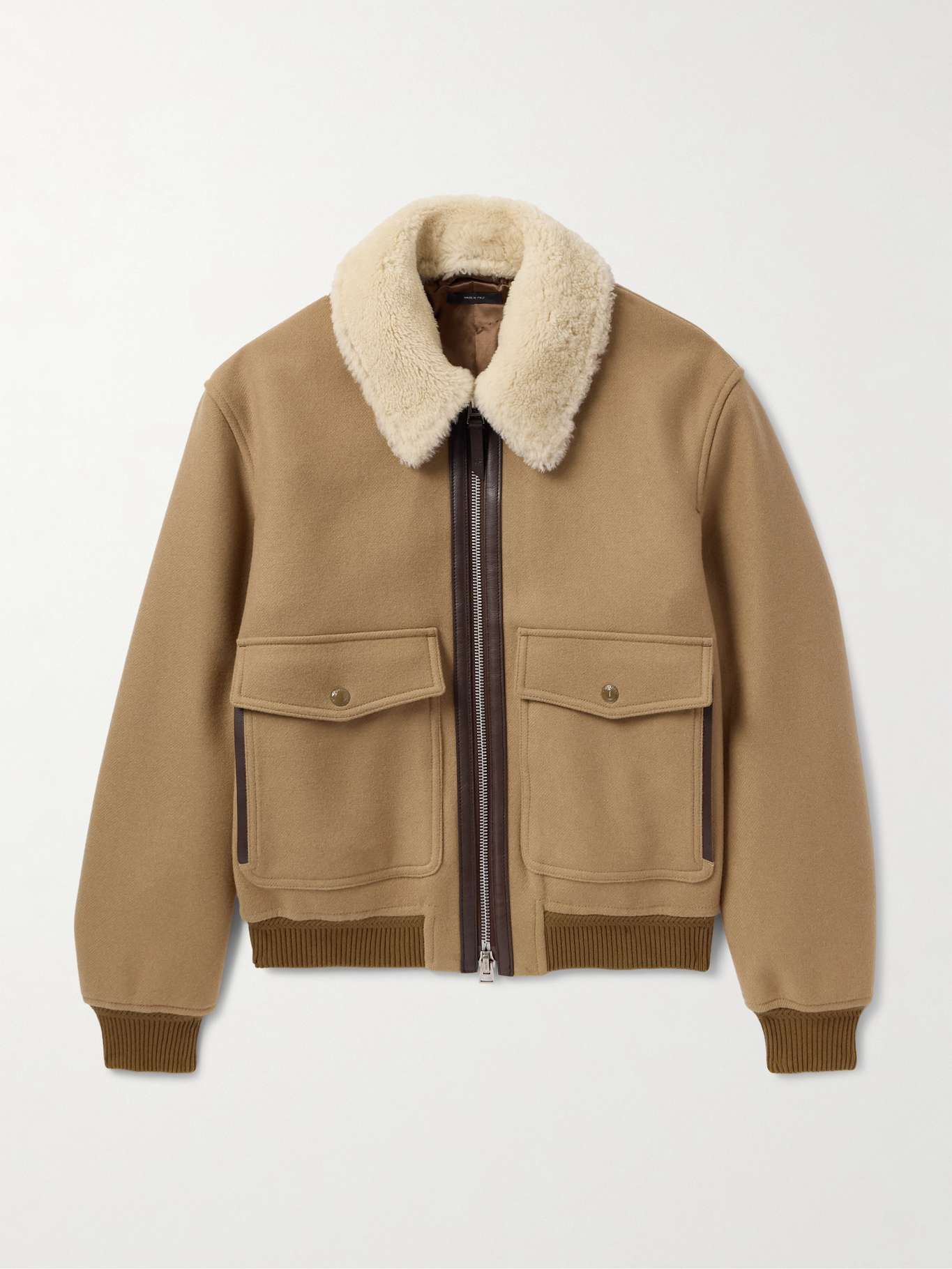 TOM FORD جاكيت بأسلوب أفياتور من مزيج الصوف البكر بحواف من الجلد والصوف الناعم