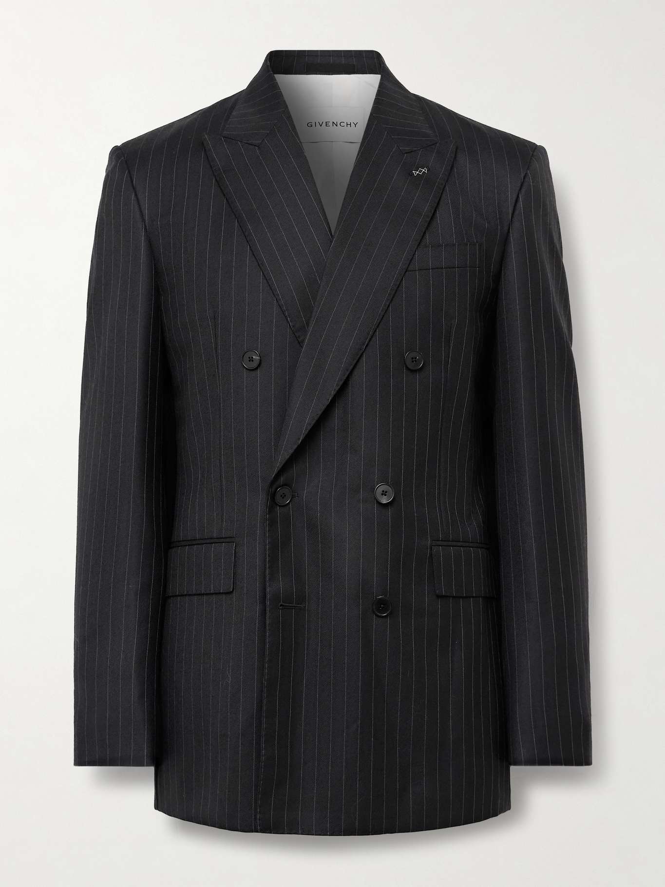 يُجسد جاكيت البدلة هذا من علامة Givenchy خبرتها في مجال الحياكة. صُنع من صوف التويل بصفين من الأزرار وزُين بخطوط ناعمة أنيقة وطيات صدر مدببة عريضة.