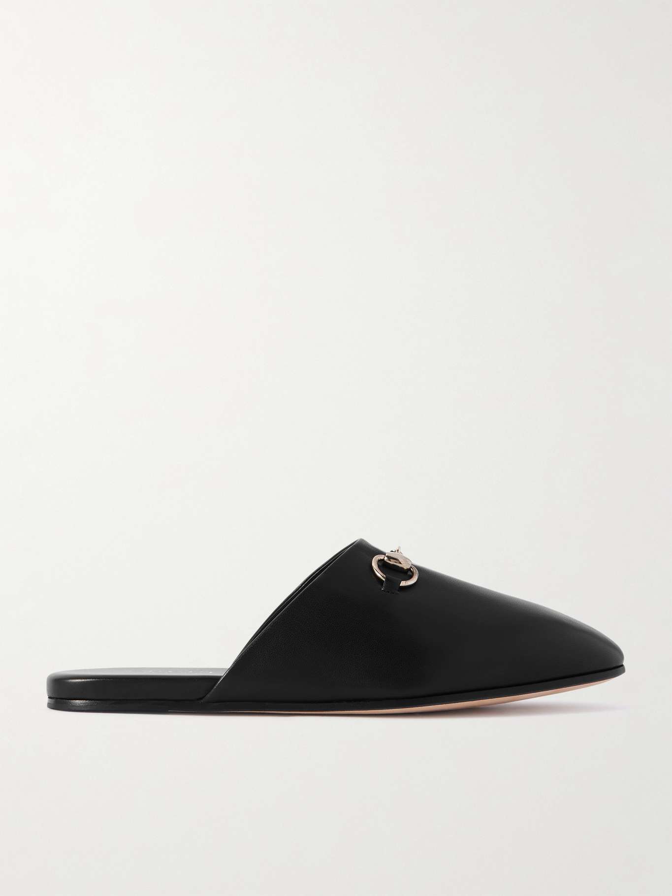 تُقدم علامة Gucci حذاء سليبرز المزين بحلية هورسبيت والذي يتميز بتصميم لا يحدّه الزمن لتتمكن من ارتدائه لعدة سنوات. صُنع من الجلد الناعم مع مقدمة لوزية الشكل وتصميم مريح مفتوح من الجهة الخلفية.