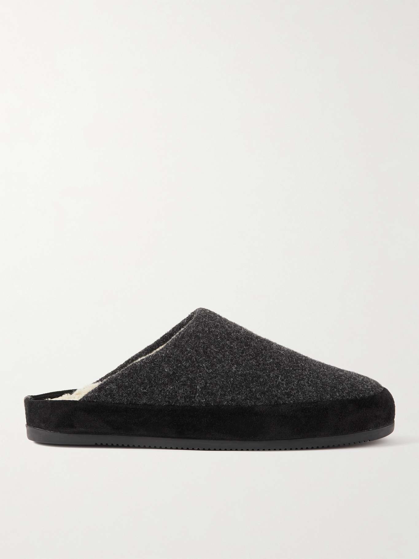 - Recycelte Wolle in Dunkelgrau, schwarzes Veloursleder (Rind), cremefarbener Shearling