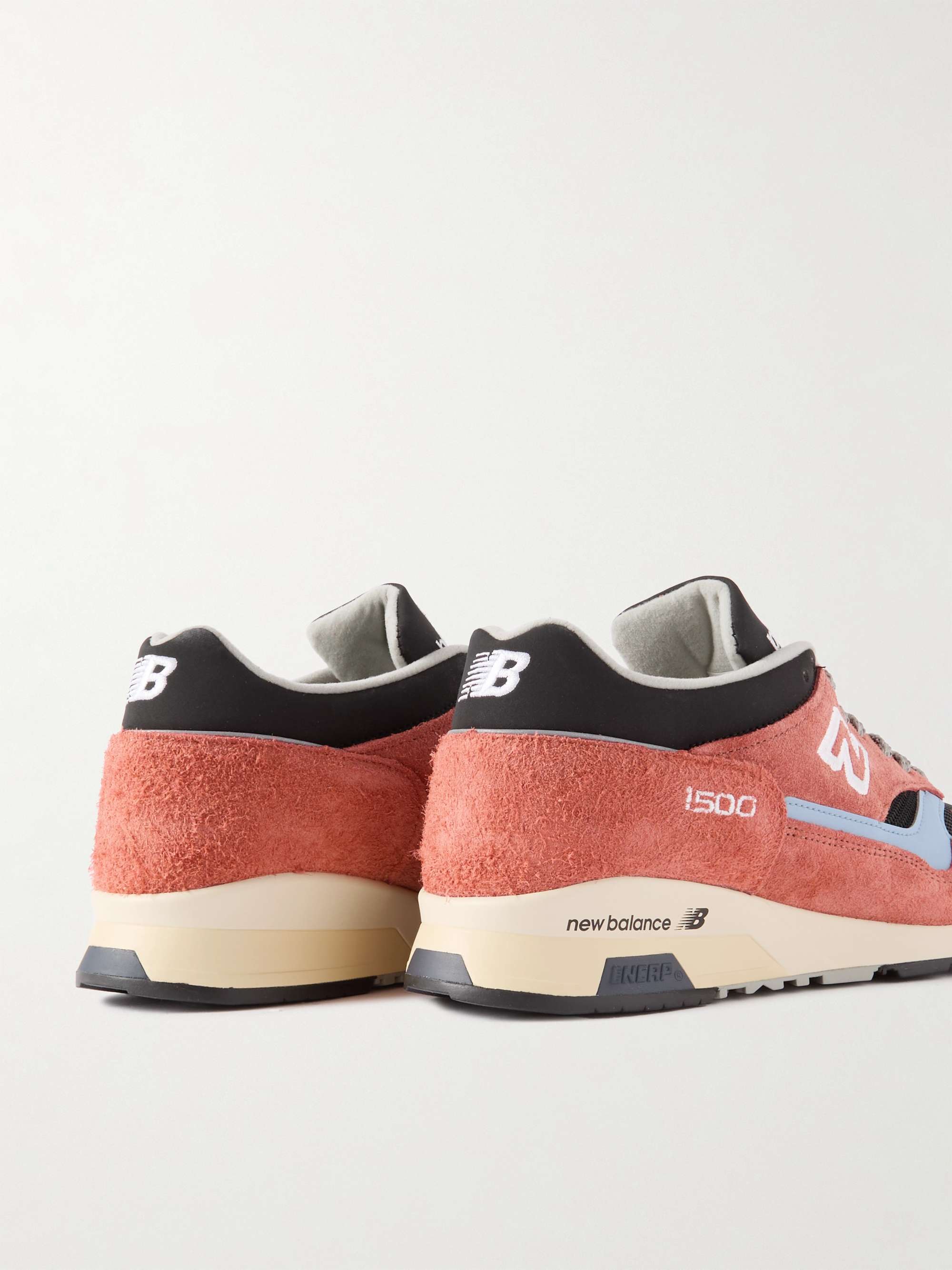 - Gebürstetes Veloursleder in Orange, Leder in Hellblau, Mesh in Schwarz