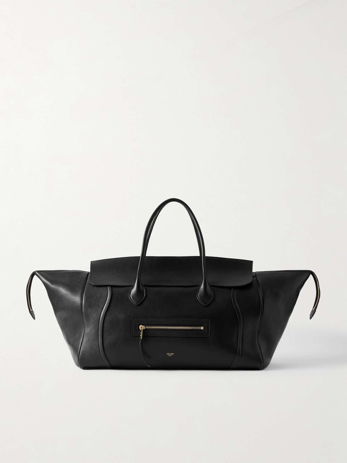 Michael Rider's debut collection at CELINE sees the revival of the 'Phantom' bag in exaggerated proportions. This 'Luggage' tote is made from soft leather in a wide trapeze shape, topped with rolled handles and the signature gold-tone zip at the front. There's ample space inside for your everyday essentials and it's great as a travel bag too.