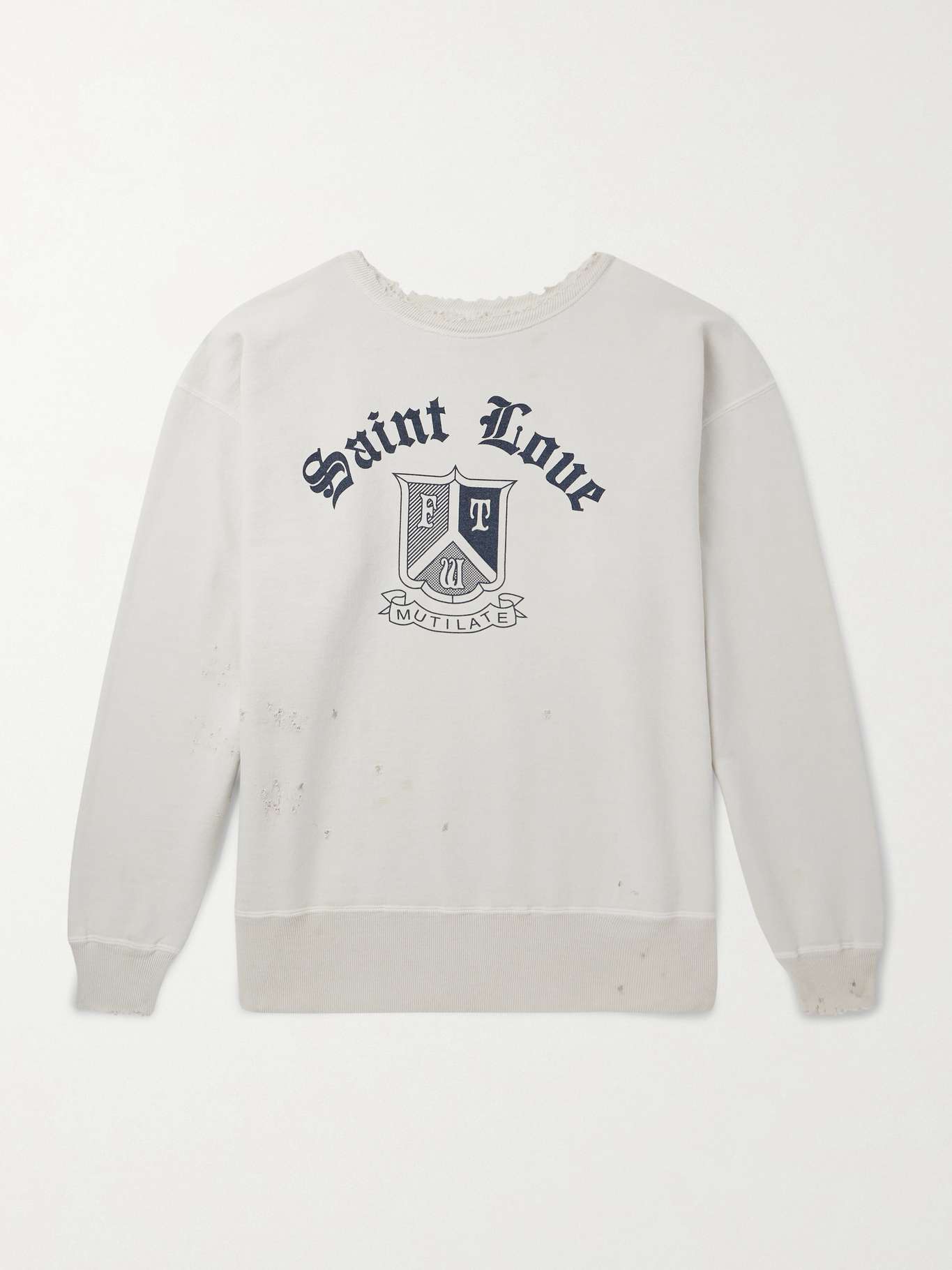 Saint Mxxxxxx's sweatshirt is printed with a collegiate inspired crest at the chest. Made to look and feel like a hand-me-down, it's cut for a loose fit from cotton-jersey that's distressed with rips, pulls and tears. The 'Saint Love' spell-out is a recurring motif.