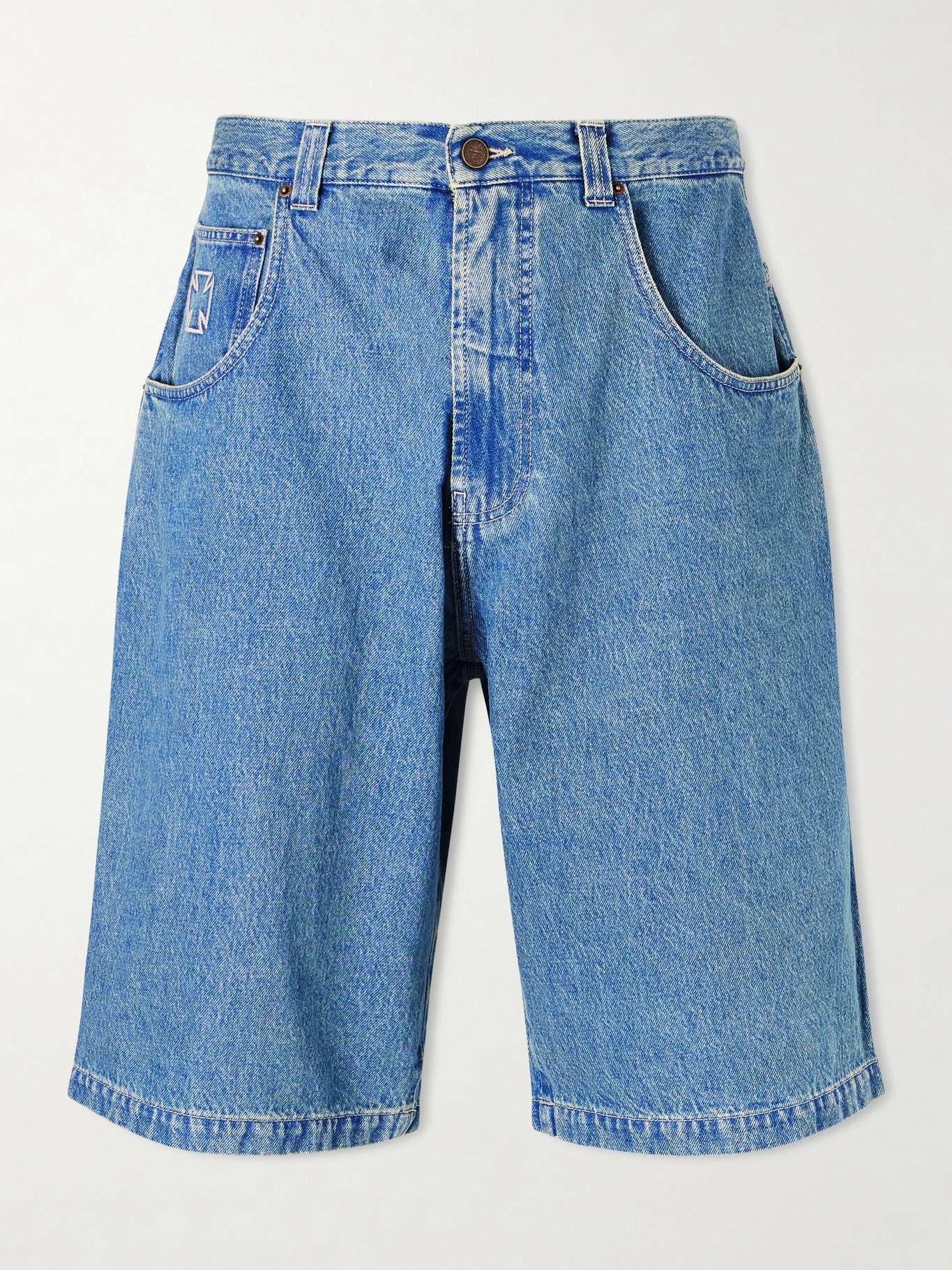 VETEMENTS Biker Cross Wide-Leg Embroidered Denim Shorts
