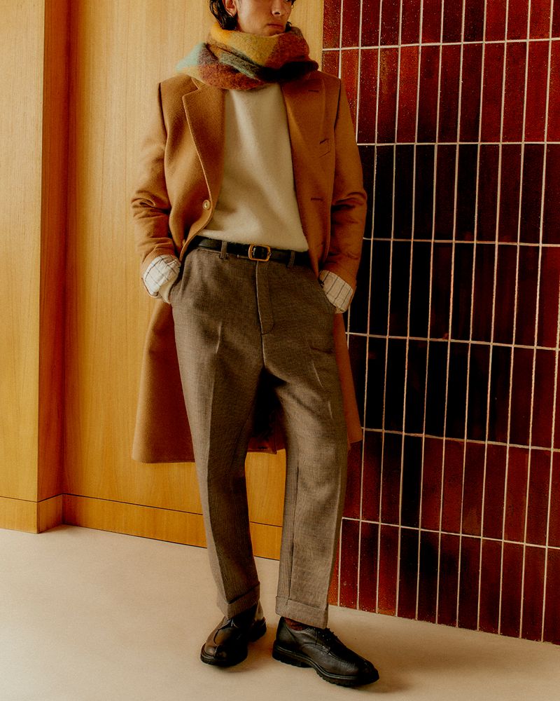 If you’re dressing up, start things off with a pair of classic leather shoes courtesy of Tricker’s, a pair of suit trousers from Beams Plus and Jil Sander’s cosy and luxurious alpaca and wool sweatshirt. Continue the classic theme with a brushed camel hair coat and a simple leather belt from Gucci.
