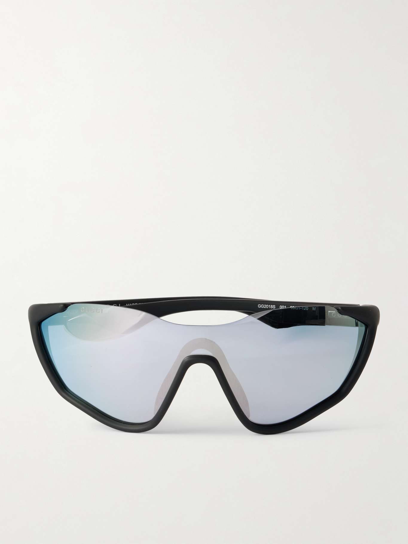 Gucci Eyewear's sunglasses have mask-shaped frames that trace the rims instead of the brow. Fitted with a sculptural mirrored lens, they've been made in Japan from matte-black injection-moulded plastic and feature logos at the temples.