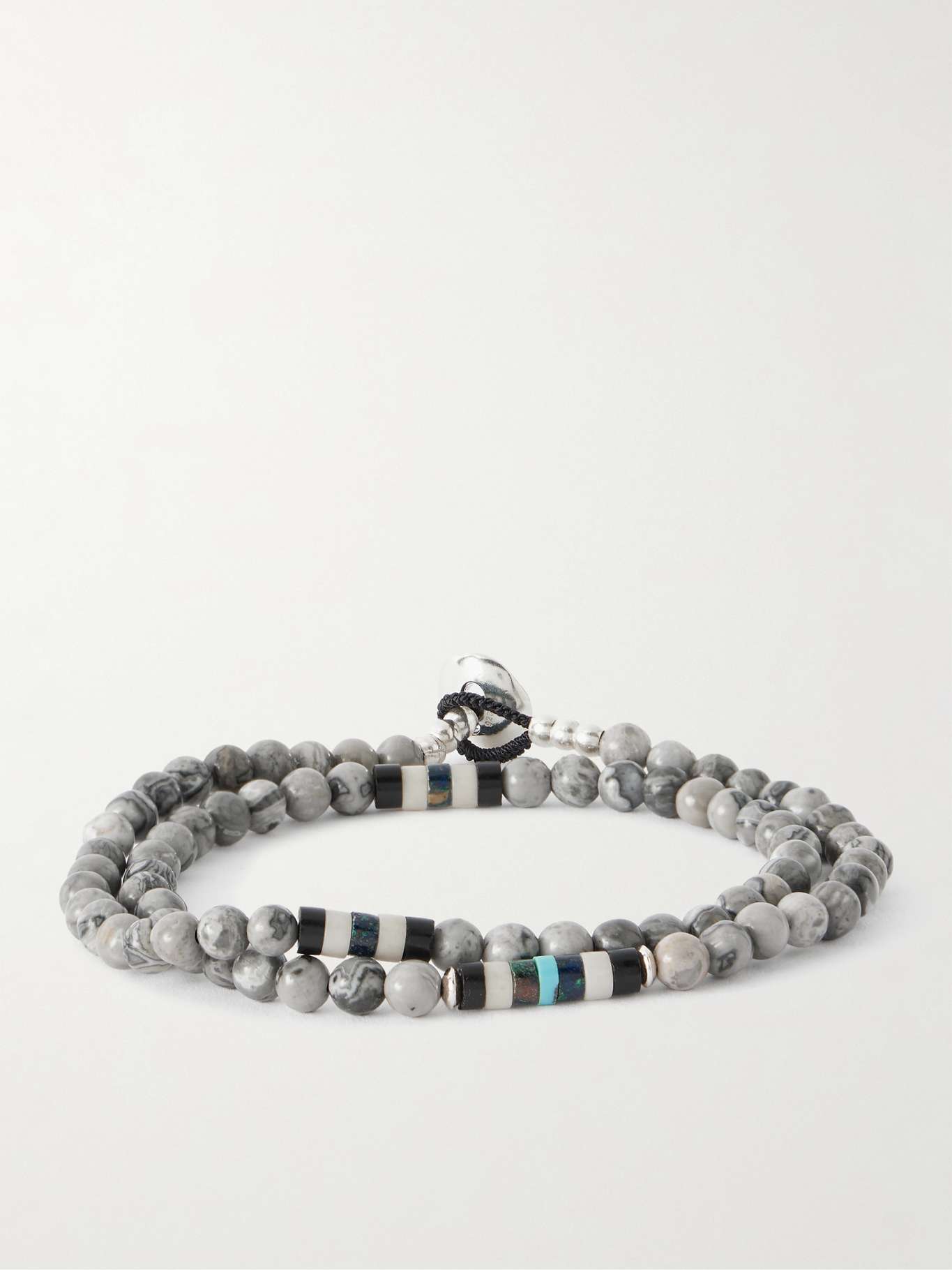Mikia's bracelet has been made in Japan from polished sterling silver strung with jasper beads. Boldly stacked with two bands, it'll add texture and colour to any outfit.