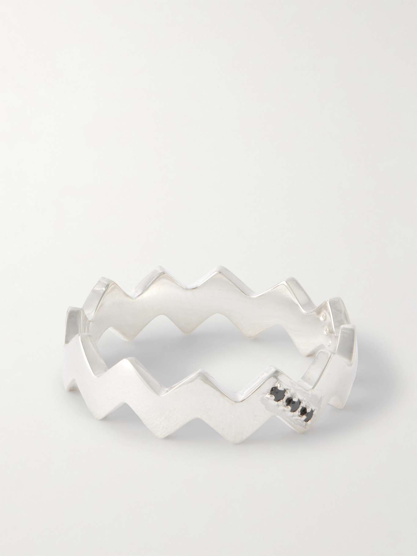 Tokyo-based Mikia's jewellery is expertly made in Japan and often influenced by the designer's global travels. This ring is cast from sterling silver in a zigzag shape inspired by slithering snakes and accented with three blackened diamonds.