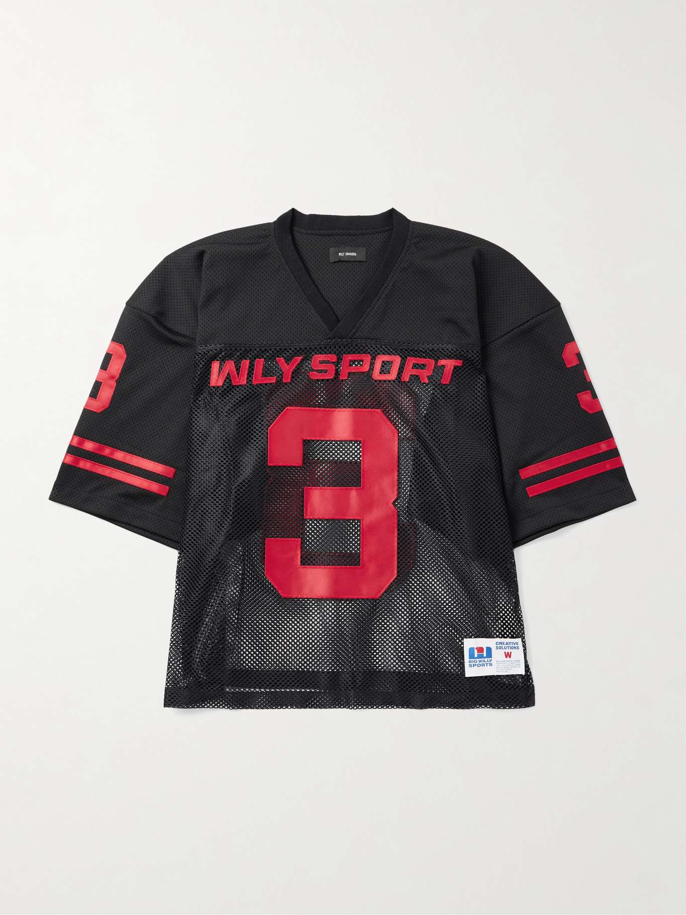 Willy Chavarria's T-shirt riffs on football jerseys. It's cut for an oversized fit from mesh with a sheer panel through the body and is appliqued with the label's sport-inspired logo at the chest.
