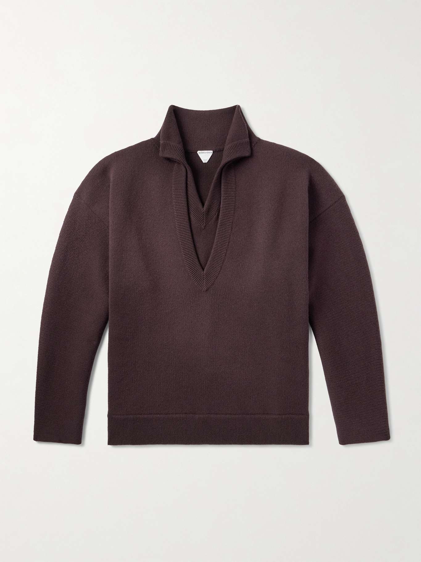 Bottega Veneta's cleverly designed sweater has a layered neckline - it appears like two stacked pieces, but their hems join. It's knitted from thick wool with the subtlest aubergine cast.