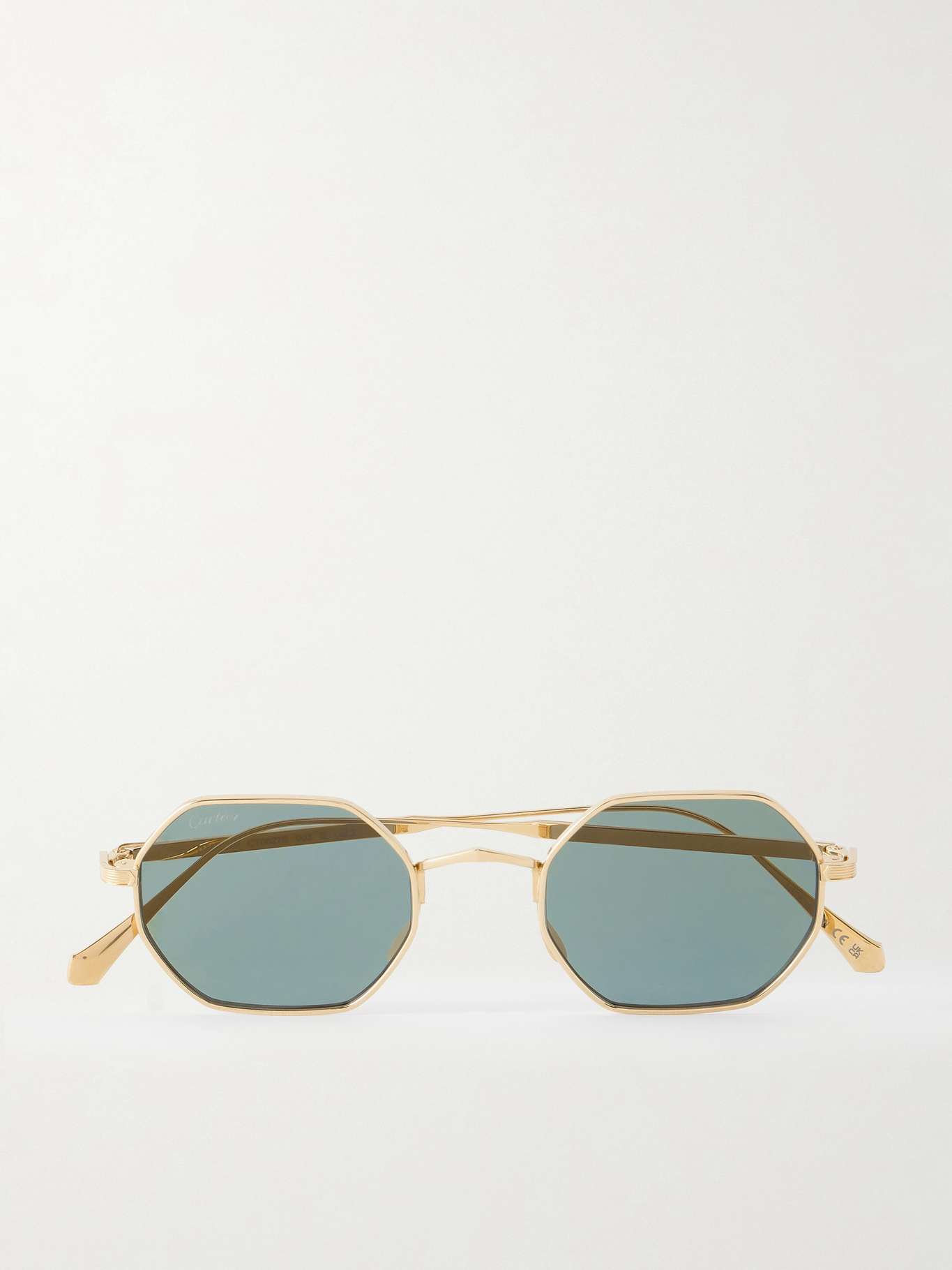 Cartier Eyewear's 'Signature C' geometric sunglasses are made from gold-tone titanium and fitted with dark lenses. Note the logo detailing on the lens and the arms.
