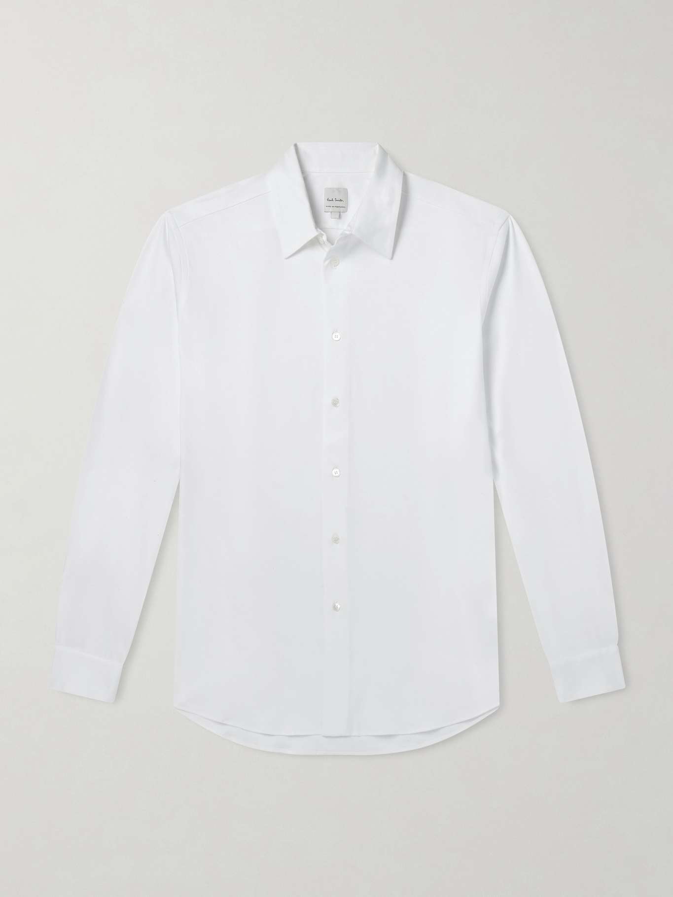 We once asked Paul Smith what a man should never be without. His answer? "The staples of a decent wardrobe: a navy blue suit, a good white shirt and a classic pair of shoes". One to wear with smart and casual outfits, this button-up is cut from cotton-poplin and fastens with pearlescent buttons.