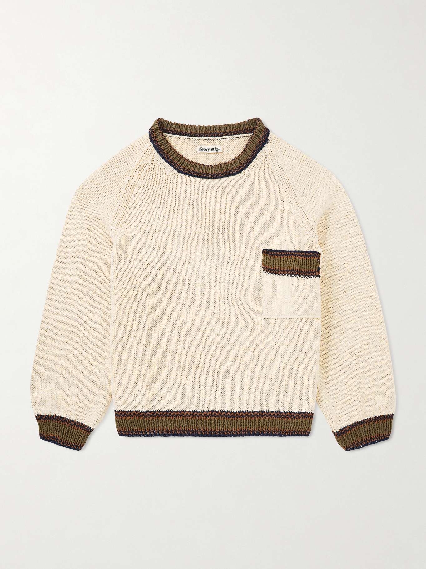 Story Mfg.'s cotton sweater is entirely hand-dyed, hand-knit and intended to get better the more you wear it. It has a relaxed fit with contrasting edges and a chest pocket.