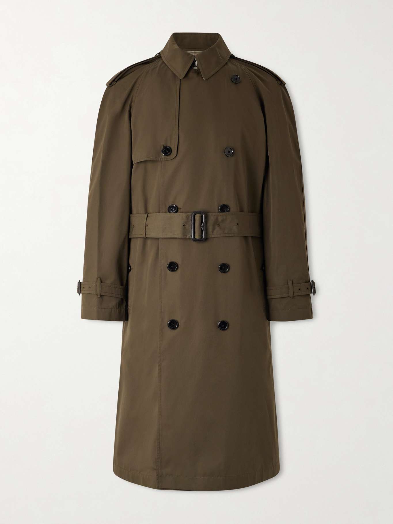 An enduring staple of British outerwear, this Burberry trench coat exemplifies the house's heritage with a contemporary sensibility. Made from cotton-gabardine, it's cut in a classic double-breasted profile and finished with traditional details like storm flaps, epaulettes and a belt - note the 'B'-shaped leather buckle.