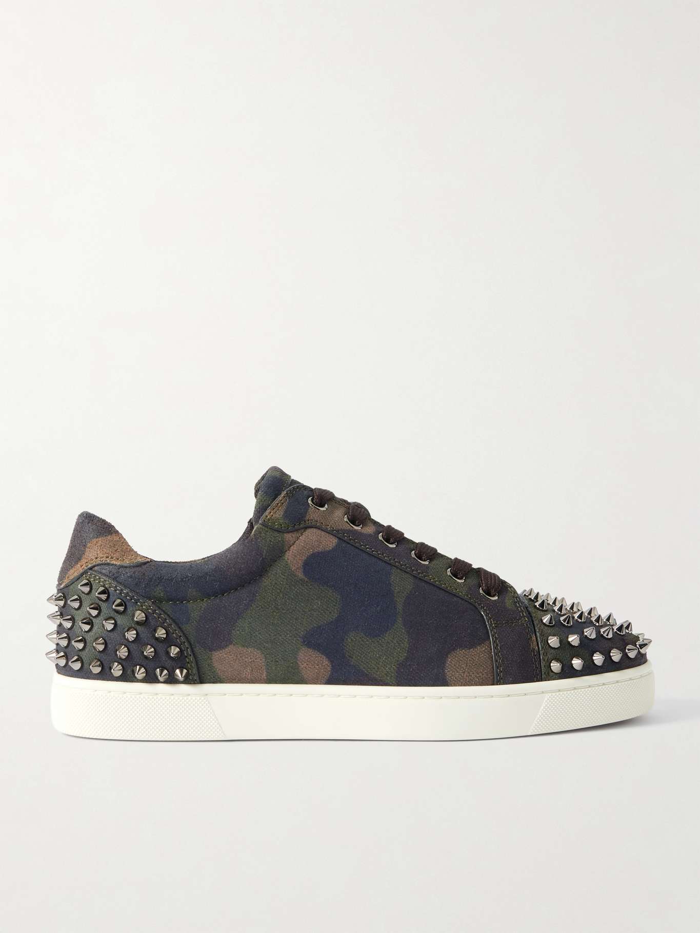 Christian Louboutin's camouflage-print 'Seavaste 2' sneakers are accented with gunmetal studs at the toe cap and heel. They're made from canvas and have rubber soles with signature red bottoms.