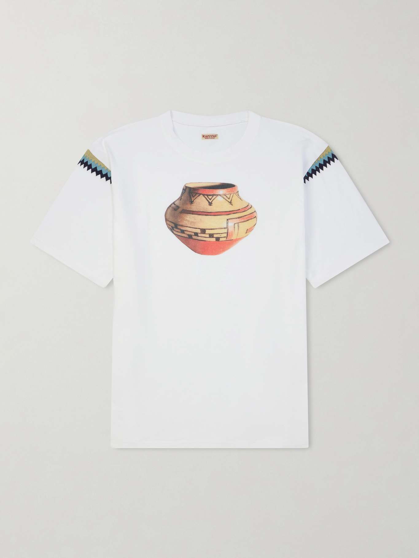Exploring territories it defines as ‘Farm’, ‘Sea’ and ‘Kountry’, KAPITAL filters cultural references through a craft-led, expressive approach. This T-shirt reflects that vision, cut from cotton-jersey in a regular fit and printed with a geometric motif at the shoulders and a clay bean pot at the chest.
