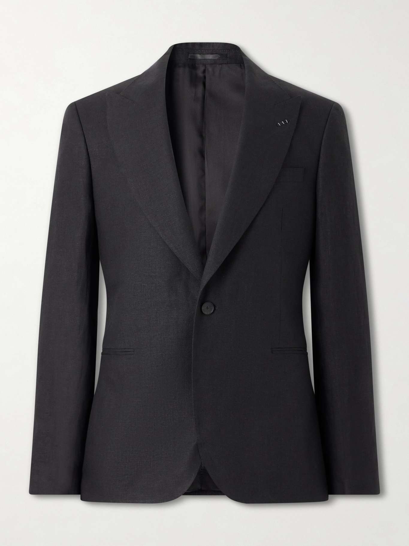 DESIGNED BY MR PORTER. A more streamlined take on eveningwear, this tuxedo jacket reflects Mr P.’s focus on proportion and fabric. Cut from linen in a slim fit with a single-button closure, it maintains a sharp yet lightweight feel.
