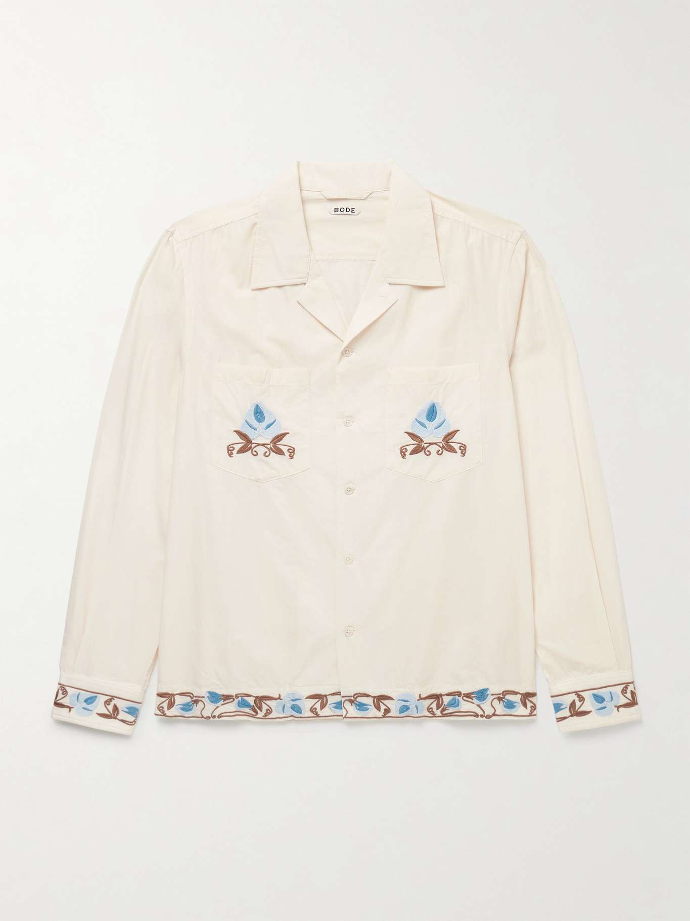 The floral embroidery on BODE's 'Nouveau Vine' shirt is inspired by a vintage pattern from the '50s. It's tailored from crisp cotton-poplin and has a relaxed camp collar.