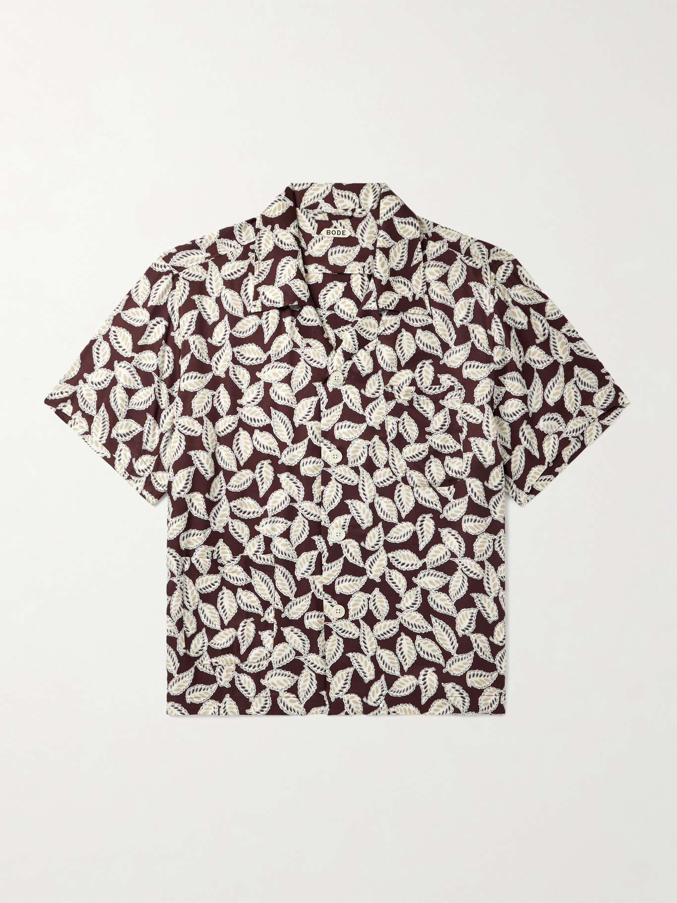 BODE's shirt is printed with skeleton leaves in homage to J.M. Barrie's classic Peter Pan play. It's cut from lightweight satin for a relaxed fit and has a laid-back camp collar.
