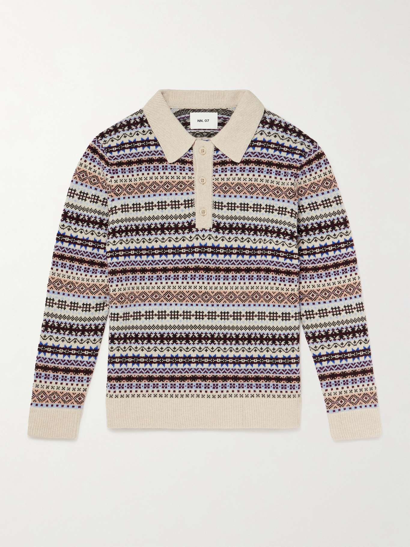NN07's 'Robbie' sweater is knitted in an intricate Fair Isle pattern and features a buttoned half-placket, reminiscent of polo styles. It's made from a warm wool-bend with ribbed trims for structure.