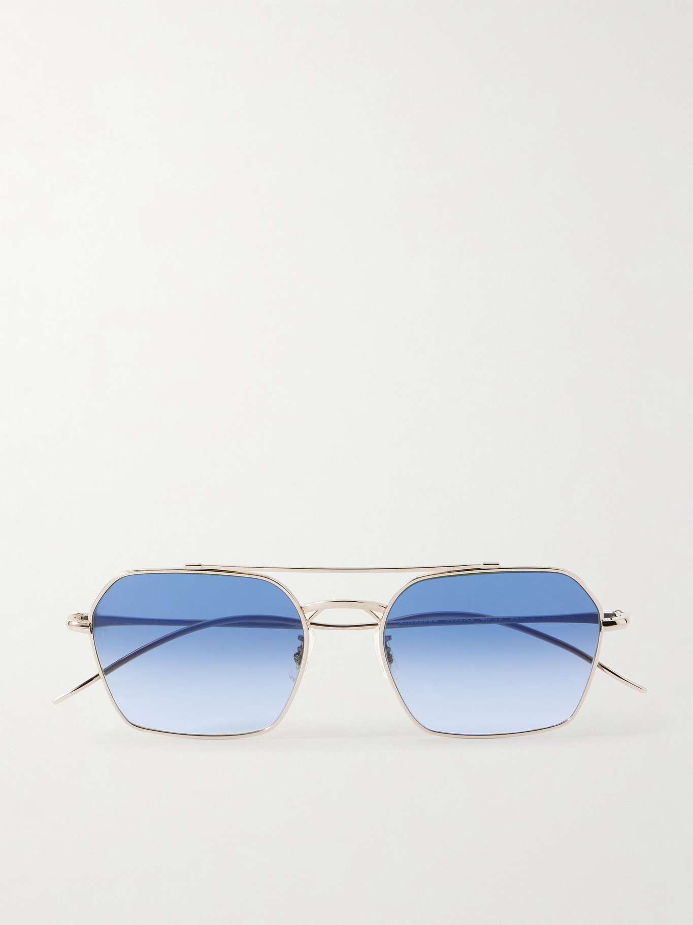 Oliver Peoples' 'TK-15' sunglasses take their cues from "modern industrial design", with sculptural elements like curved arms and a slim double bridge. They've been made in Japan from gold-tone titanium and fitted with cool 'Marine Gradient' lenses.