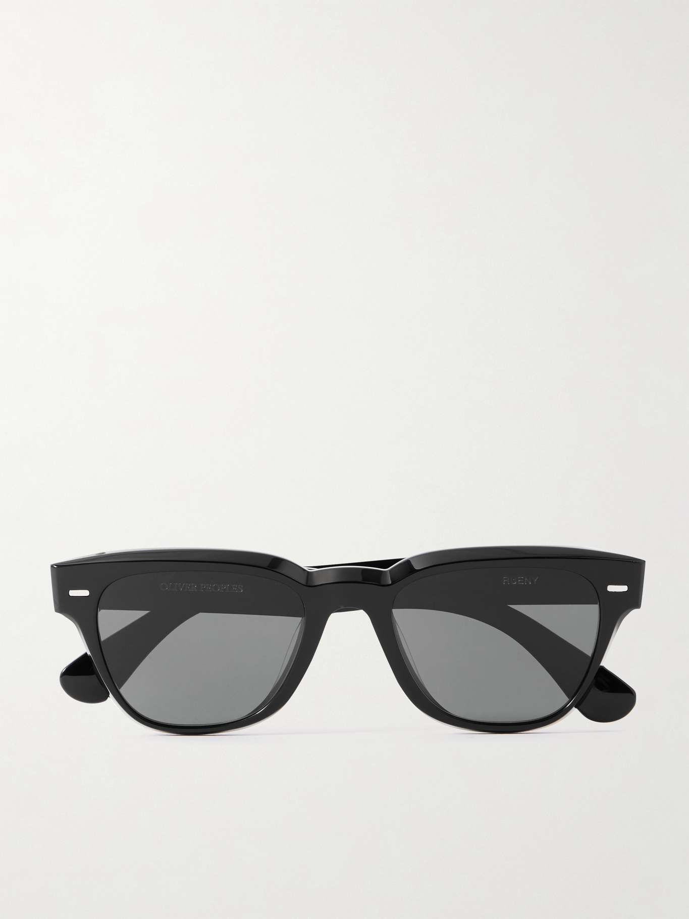Oliver Peoples' 'Rueny' sunglasses are a classic D-frame pair that will always be in style. Made from glossy black acetate, they have the label's signature silver-tone temple pins and dark grey-tinted lenses.