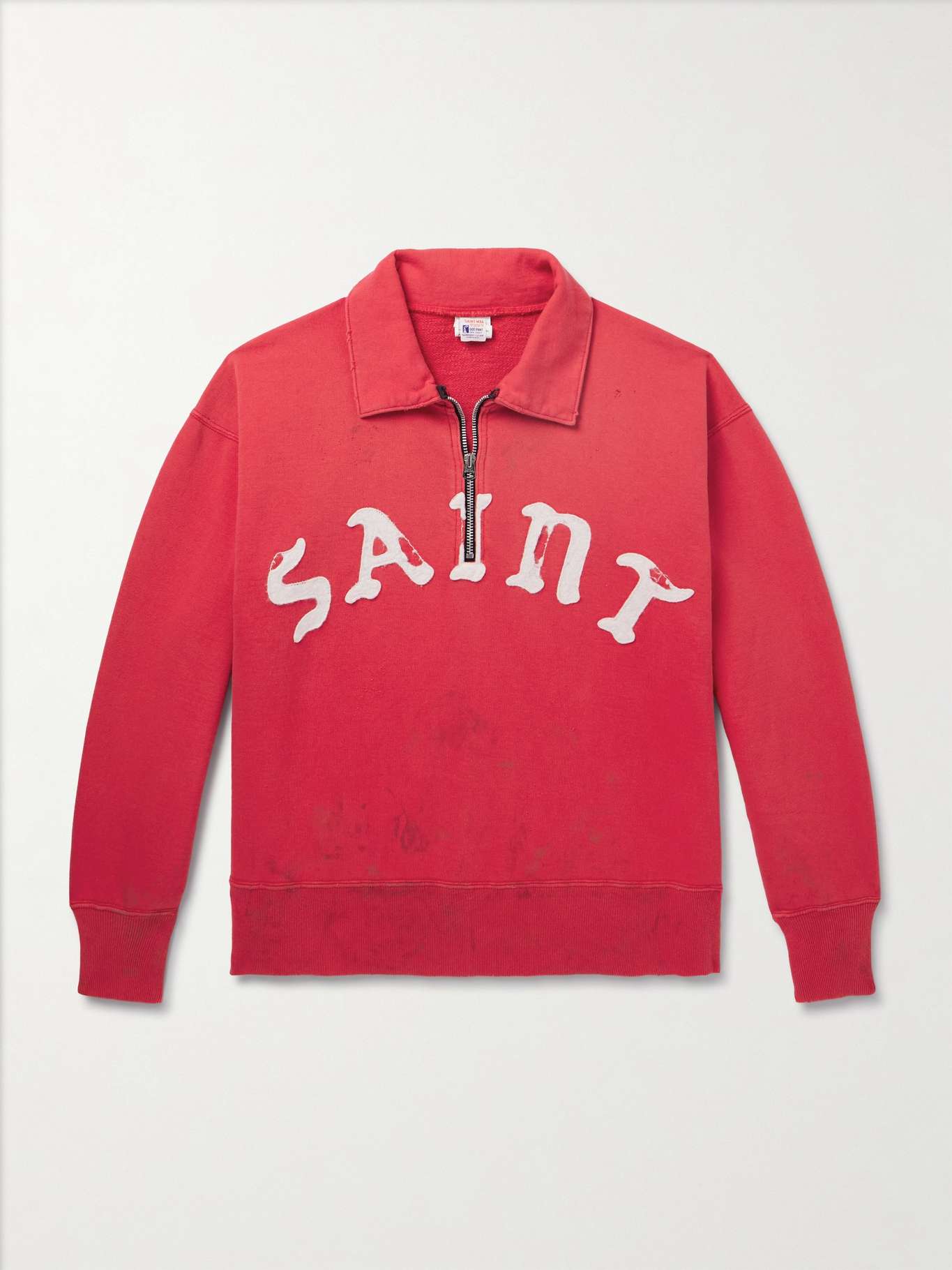 For Saint Mxxxxxx founders Cali Thornhill Dewitt and Yuta Hosakawa, it's vintage over everything - the brand's pieces are treated to feel like thrift store finds. This half-zip sweatshirt is made from midweight cotton-jersey and appliquéd with a purposely distressed logo across the front.