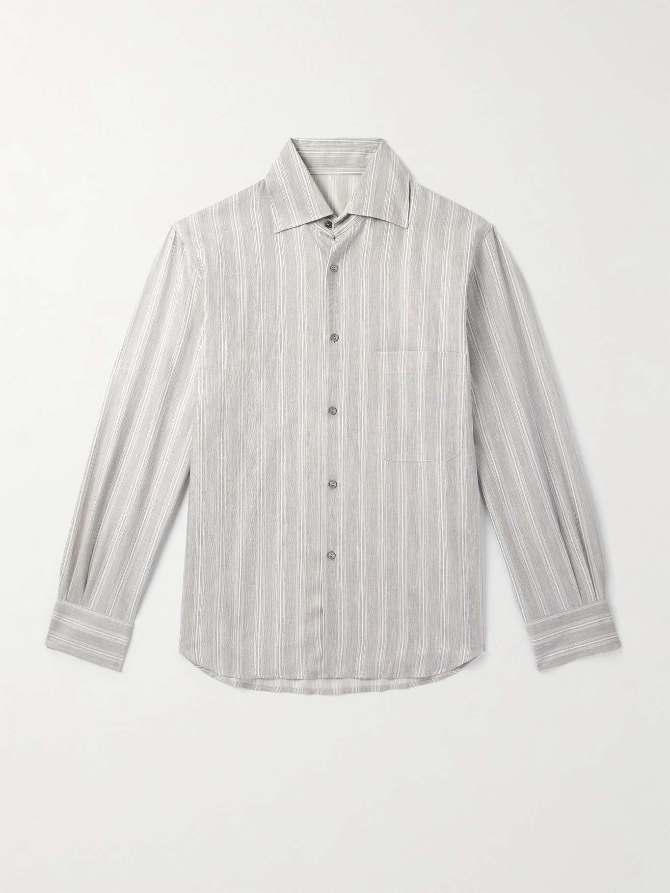 Stòffa captures the zeitgeist with its precision and design intentionality. Showcasing its eye for tailoring, this shirt is made from cotton and silk-blend Dupioni – a plain-weave fabric with a subtle sheen – and is woven with neat pinstripes. It's cut for a loose fit, with a spread collar and pleated sleeves, and threaded with mother-of-pearl buttons throughout.
