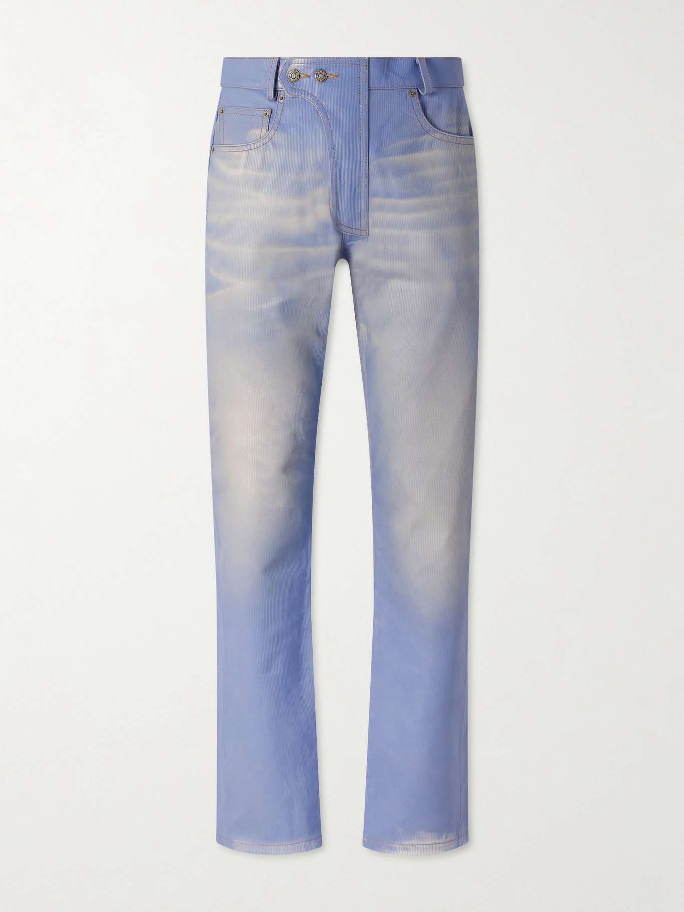 424 blends workwear with streetwear codes to create pieces that feel both raw and considered. These trousers are cut from smooth leather in a classic five-pocket silhouette, drawing on motorwear influences, and feature an extended tab closure at the waistband secured with snap buttons. Treated and painted to resemble vintage denim, they subvert expectations while retaining a rugged edge.