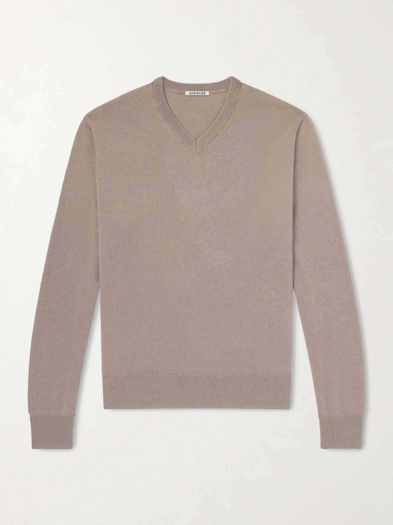 Auralee’s sweater is knitted from an equal blend of cashmere and silk in a superfine yarn that gives it a light, airy handle. The soft V-neckline layers neatly over collared shirts.