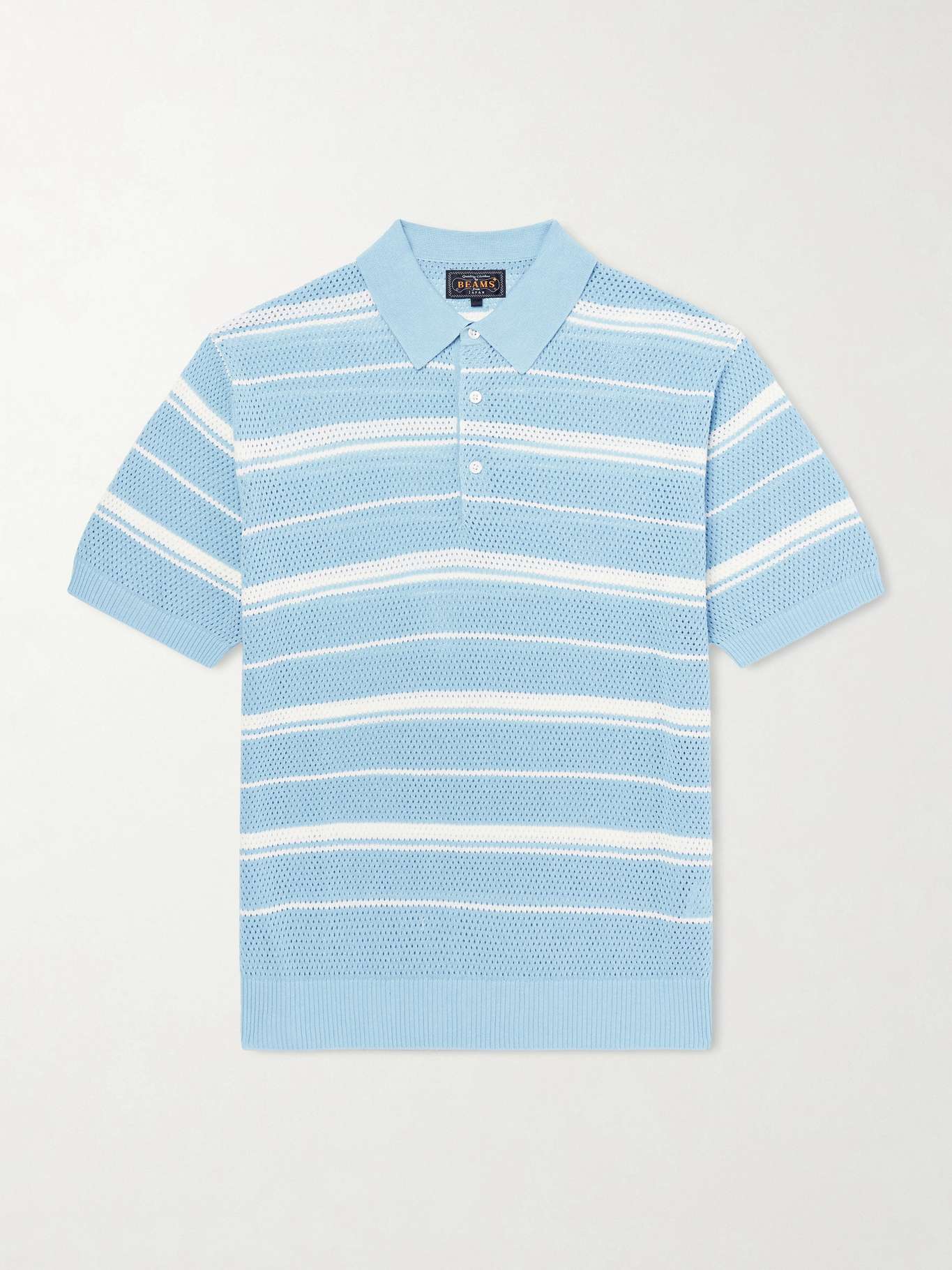 Beams Plus' polo shirt is mesh-knitted from cotton in a white and light blue striped pattern, offering breathability, a softly textured handle and a subtly sheer appearance. A ribbed collar, cuffs and hem, along with a thoughtfully proportioned button placket, complete the design.