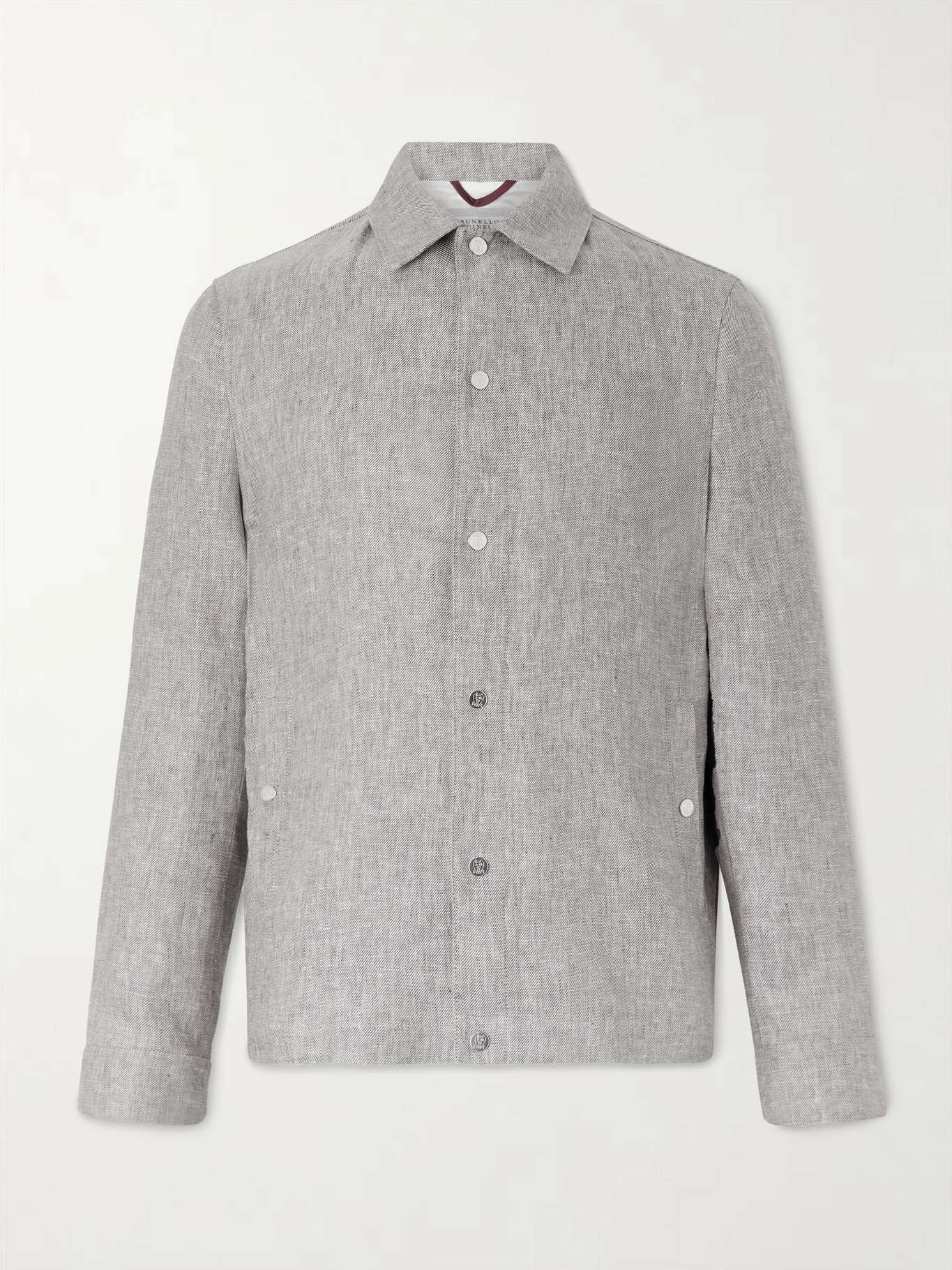 Brunello Cucinelli’s jacket is made from a lightweight hemp and linen-blend twill, and fastens with silver-tone snaps, each engraved with the brand’s signature crest.
