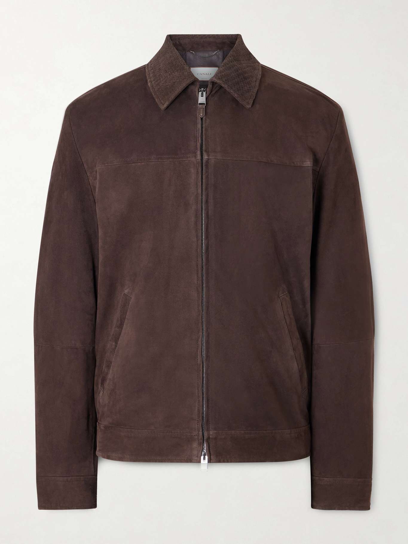 When it comes to outerwear, quality makes all the difference. Canali’s jacket is crafted from premium brown suede and finished with sleek, matte hardware. The neatly woven collar highlights the brand’s attention to craftsmanship.