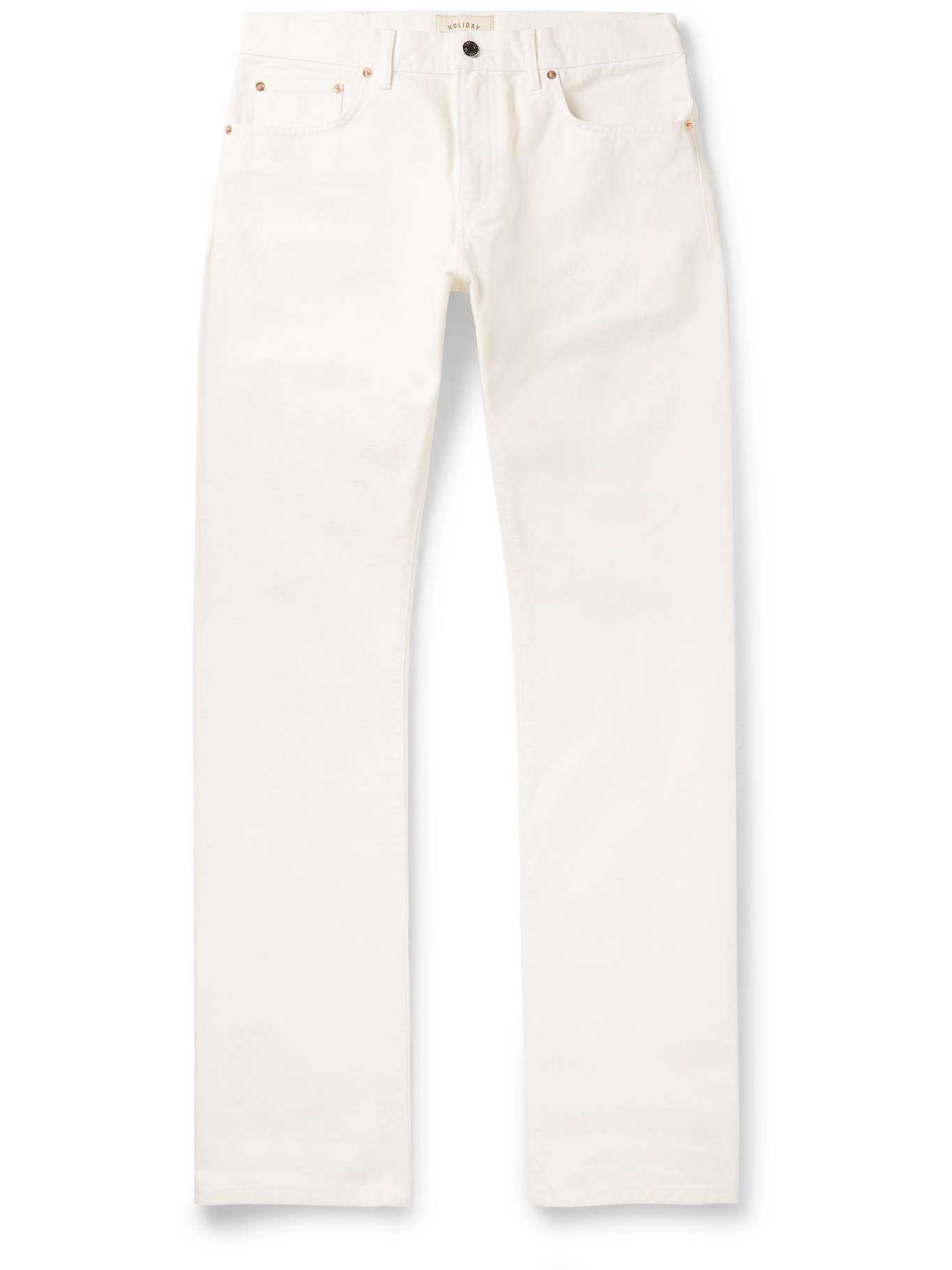 Holiday Boileau's jeans are an off-white shade that's a fresh trade for your go-to blue pair come warm weather. They're cut in a neat straight shape that has plenty of room to move and accented with contrasting brass hardware. Shown here with Folk T-shirt, AMI jacket, Converse sneakers.