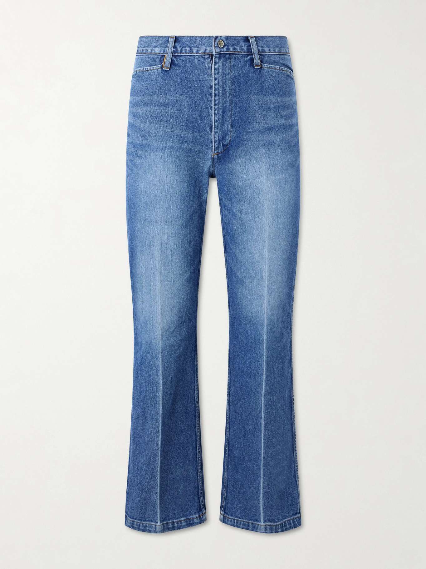KAPITAL’s jeans reinterpret classic denim through a distinctive, subtly subversive lens. Cut in a flared silhouette from denim with a faded pressed crease, they are garment-washed for a vintage look and offer a streamlined yet expressive shape. Departing from tradition, they feature a snap-button closure in place of the standard top button, adding a utilitarian twist to the familiar five-pocket design.