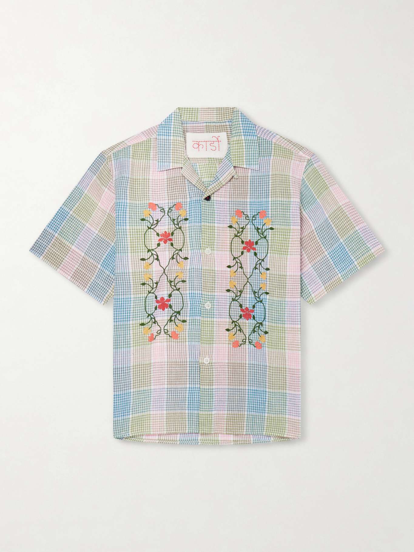 KARDO Ronen Camp-Collar Floral-Embroidered Checked Cotton and Linen-Blend Shirt
