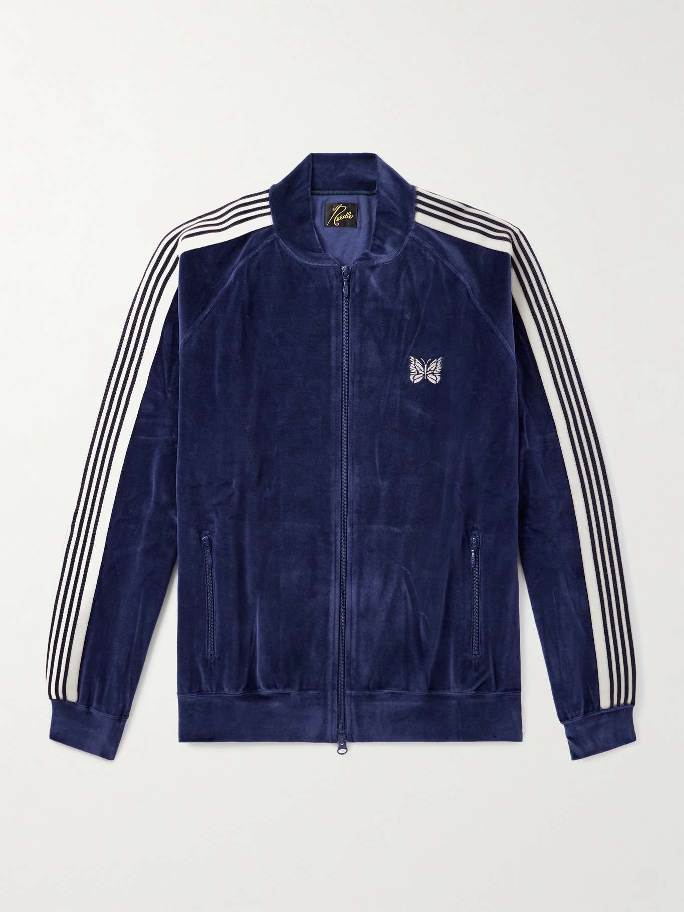 The track jacket is one of Needles' most recognisable styles. Defined by contrasting stripes along the shoulders and sleeves, this version is made from plush cotton-blend velour and embroidered with the brand's butterfly at the chest.
