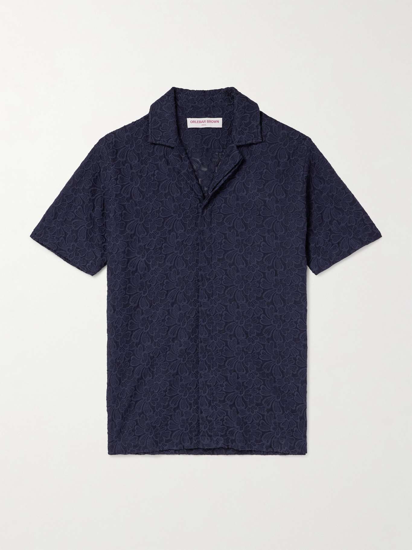 Orlebar Brown's 'Maitan' shirt is cut from navy cotton artfully embroidered with blooms in the same 'Night Iris' colour as the backdrop, keeping the effect a little more understated. It's topped with a laid-back camp collar.