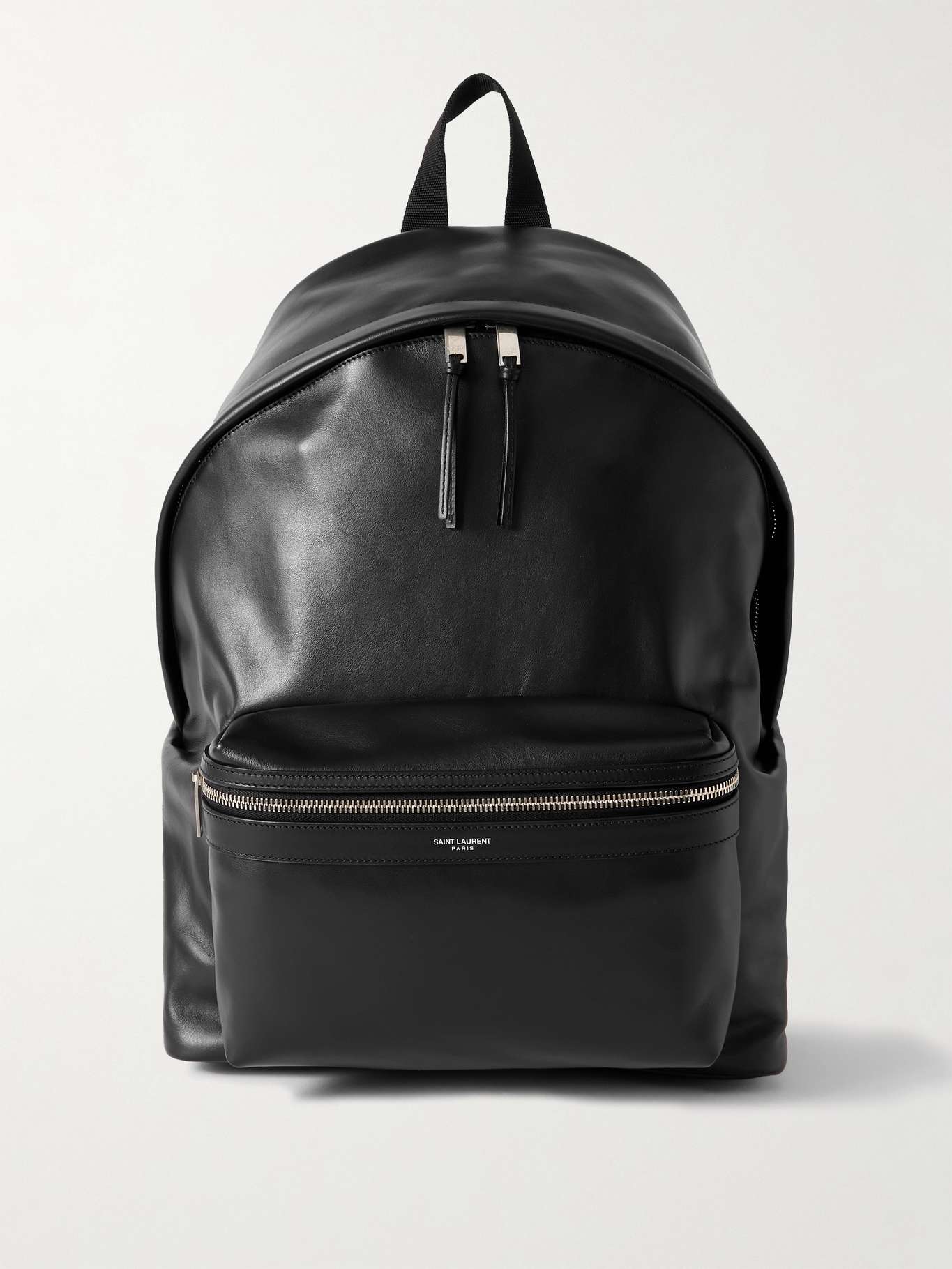 SAINT LAURENT's 'City' backpack has been made in Italy from supple black leather. It has a handy front pocket and opens to reveal a generously sized compartment with a padded sleeve to stow a laptop or tablet.