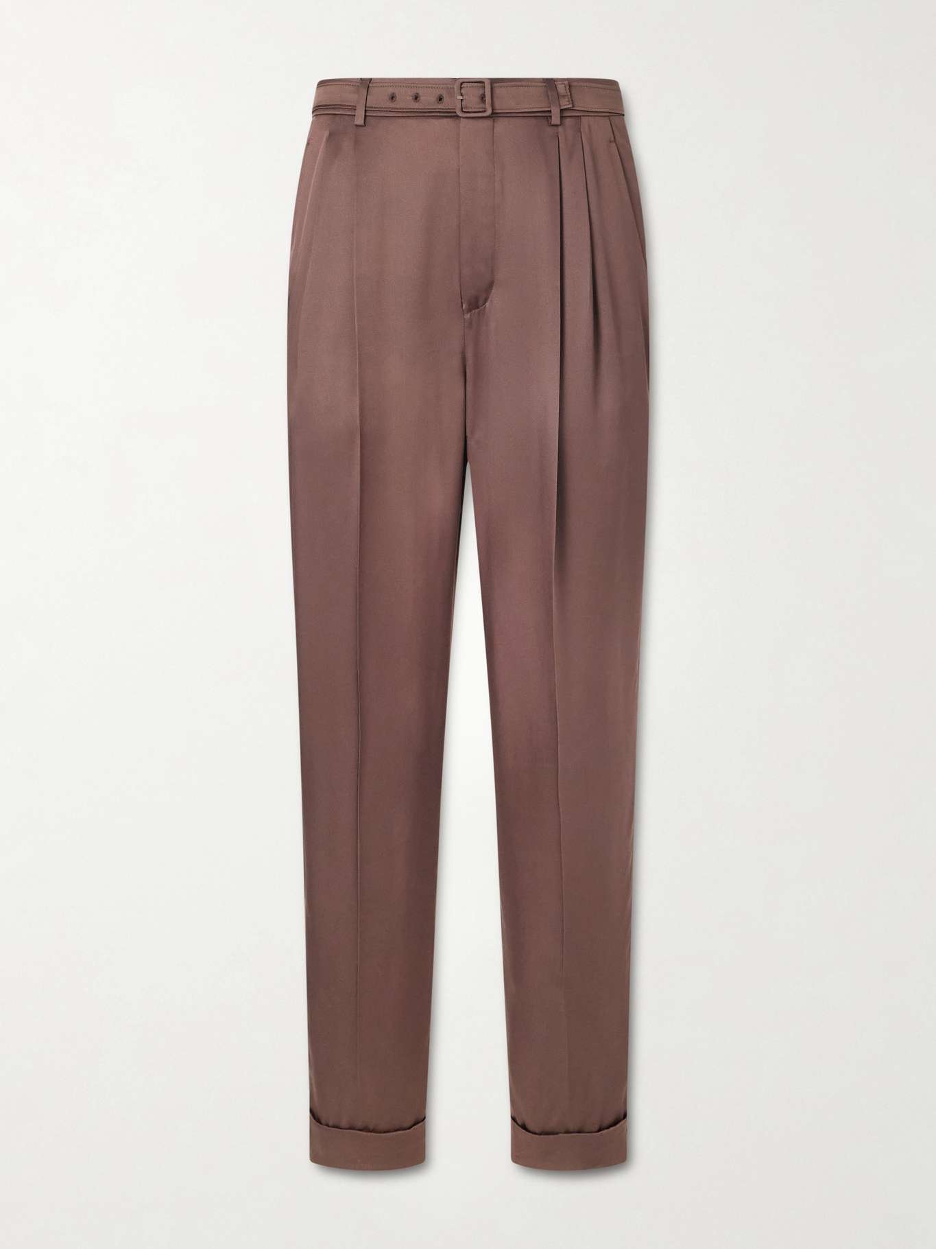 SAINT LAURENT brings a refined, evening-ready sensibility to tailoring with these tapered trousers. Cut from lustrous silk-satin, they have a fluid drape, sharp pleats and a built-in belt for a streamlined finish.