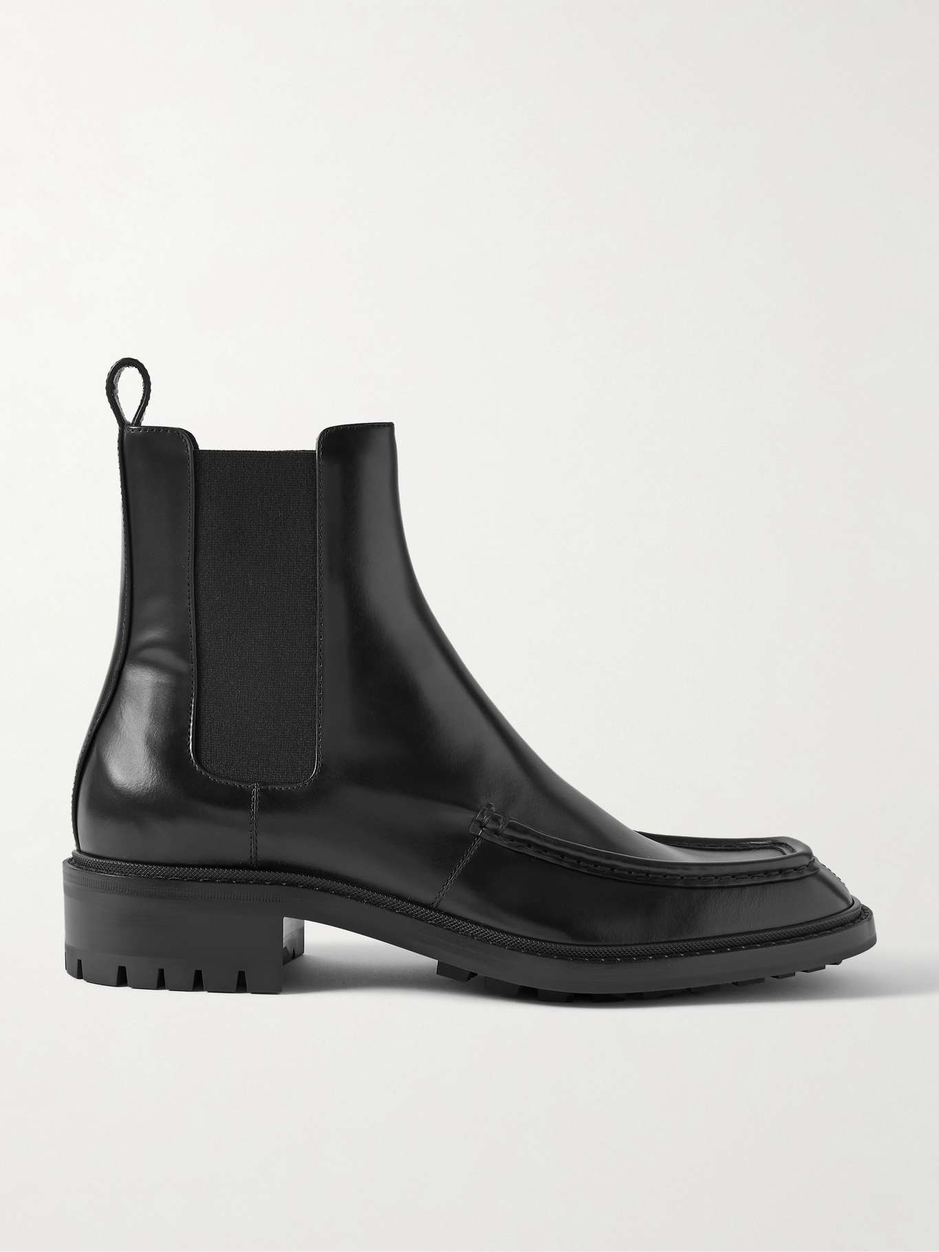 SAINT LAURENT’s ‘Wesh’ Chelsea boots have elongated square toes emphasised by raised seams. They’ve been made in Italy from glossy black leather and have elasticated side panels and handy pull tabs.
