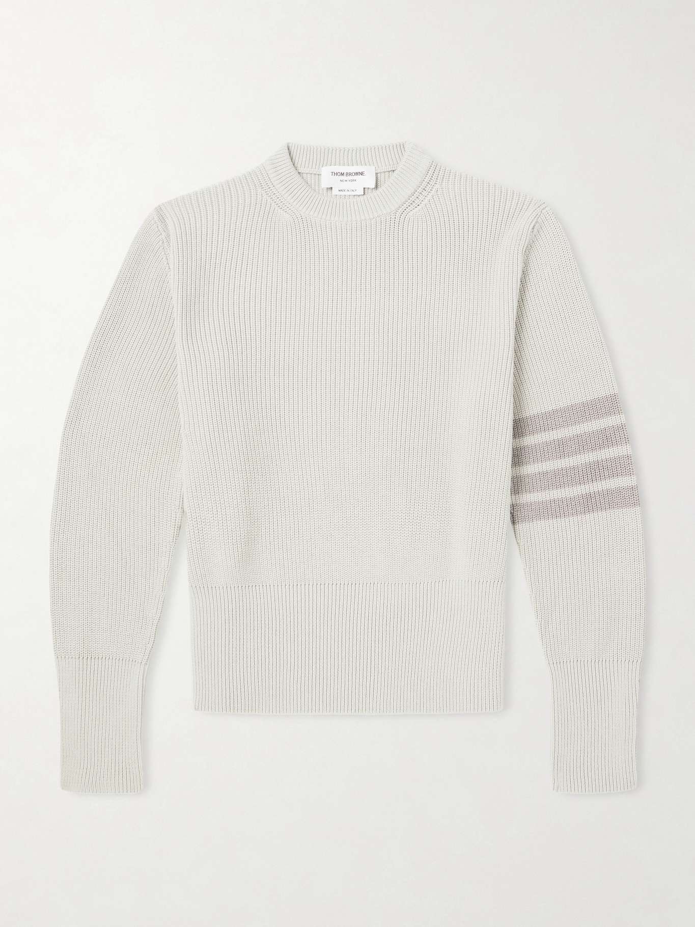 Thom Browne's famous four-stripes are subtler in a tonal-beige palette. This sweater is knitted from cotton and garment-dyed for greater softness.
